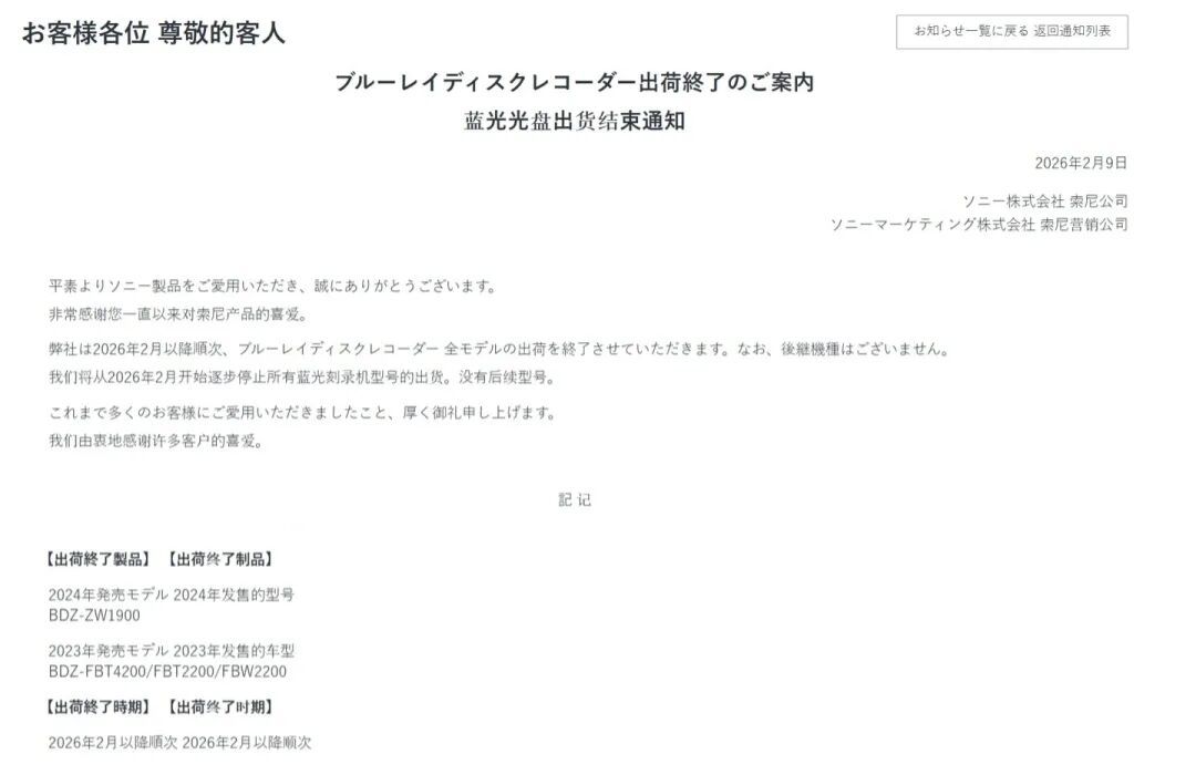 界面新闻获悉,当地时间2月9日,蓝光光盘标准的核心开创者索尼在其官网发布公告,宣布自2月起逐步停止旗下所有蓝光录像机产品的出货,且明确表示“无后续机型规划”,标志着这家科技巨头彻底退出家用蓝光录像机硬件市场。